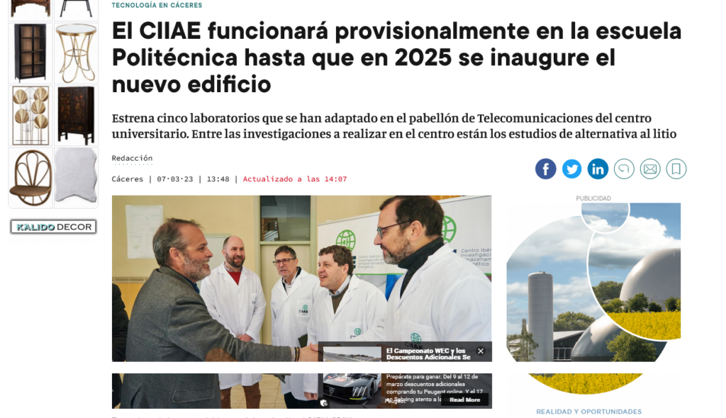 Medio / Plataforma: La Vanguardia / Prensa escrita Enlace de la publicación: https://www.lavanguardia.com/local/extremadura/20230307/8806594/ciiae-estrena-laboratorios-escuela-politecnica-caceres-inaugure-nuevo-edificio-2025.html