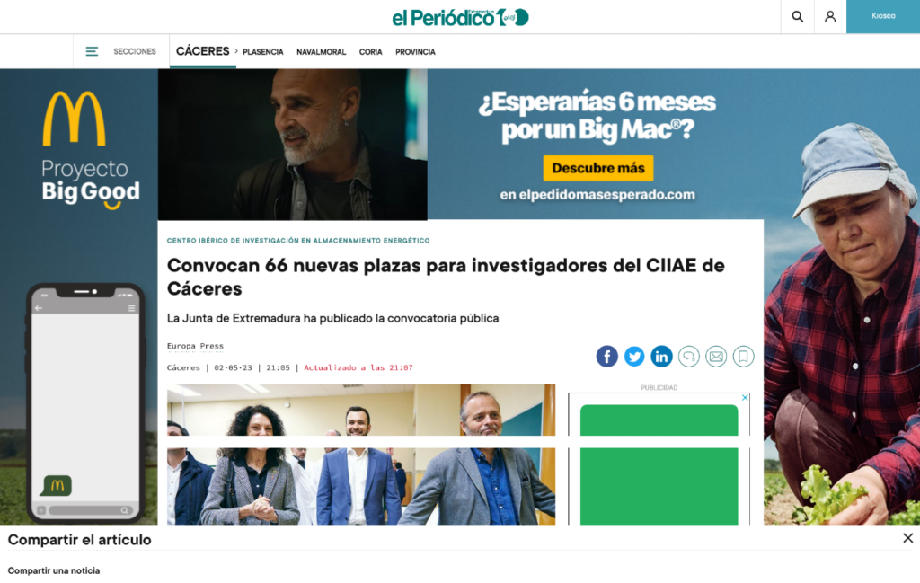 Medio / Plataforma: Diario HOY / Prensa Escrita Enlace de la publicación: https://www.hoy.es/caceres/convocadas-plazas-centro-iberico-investigacion-almacenamiento-energetico-20230502164050-nt.html