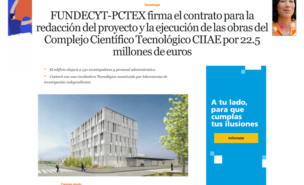 Medio / Plataforma: El economista / Prensa Escrita Enlace de la publicación: https://www.eleconomista.es/tecnologia/noticias/12082820/12/22/FUNDECYTPCTEX-firma-el-contrato-para-la-redaccion-del-proyecto-y-la-ejecucion-de-las-obras-del-Complejo-Cientifico-Tecnologico-CIIAE-por-225-millones-de-euros.html