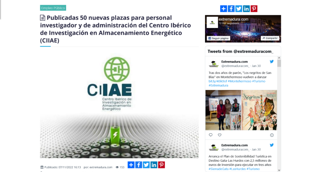 Medio / Plataforma: Extremadura / Prensa Escrita Enlace de la publicación: https://www.extremadura.com/noticias/2022/11/07/publicadas-50-nuevas-plazas-para-personal-investigador-y-de-administracion-del-centro-iberico-de-investigacion-en-almacenamiento-energetico-ciiae