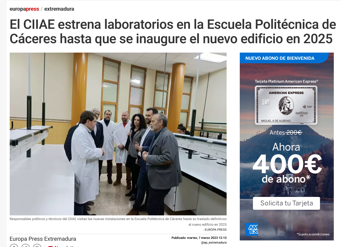 Enlace de la publicación: https://www.europapress.es/extremadura/noticia-ciiae-estrena-laboratorios-escuela-politecnica-caceres-inaugure-nuevo-edificio-2025-20230307121327.html