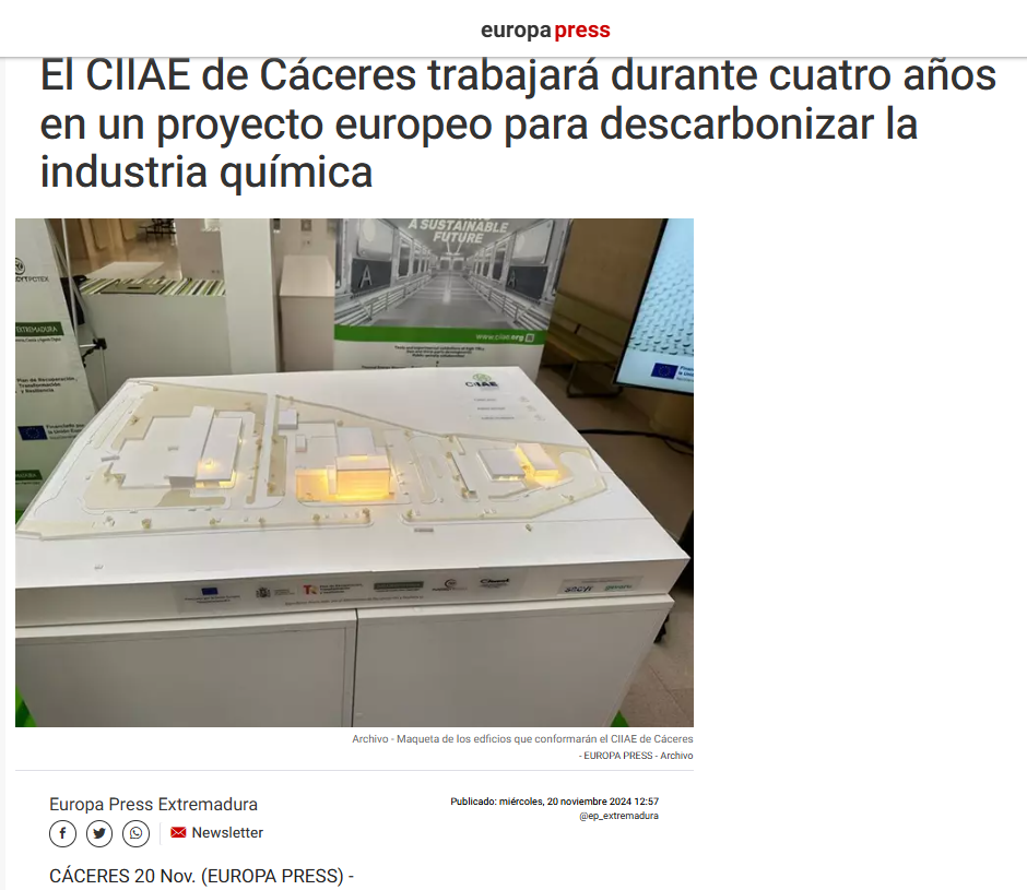 Enlace de la publicación: https://www.europapress.es/extremadura/noticia-ciiae-caceres-trabajara-cuatro-anos-proyecto-europeo-descarbonizar-industria-quimica-20241120125715.html
