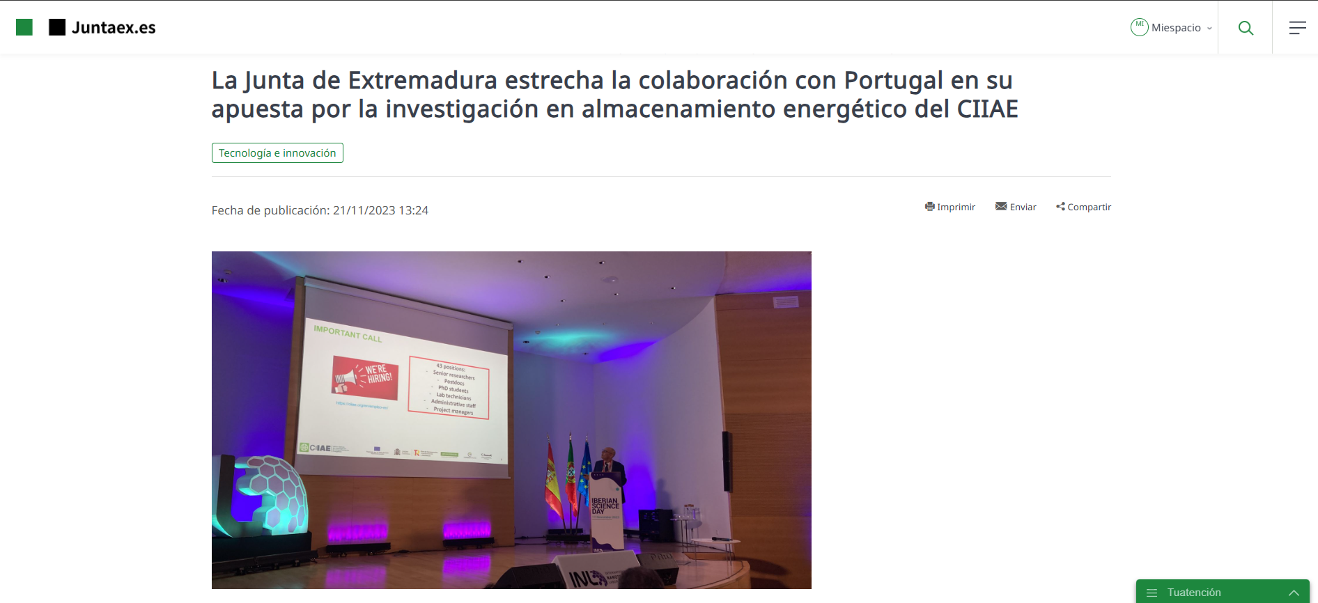 La Junta de Extremadura estrecha la colaboración con Portugal en su apuesta por la investigación en almacenamiento energético del CIIAE